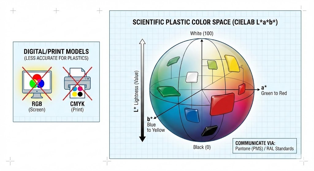 Voordat we in de machine duiken, is het van cruciaal belang om te begrijpen hoe kleur werkt in een fysiek, driedimensionaal medium zoals plastic. Veel ontwerpfouten ontstaan omdat belanghebbenden vertrouwen op digitale kleurmodellen die zich niet goed vertalen naar fysieke productie.