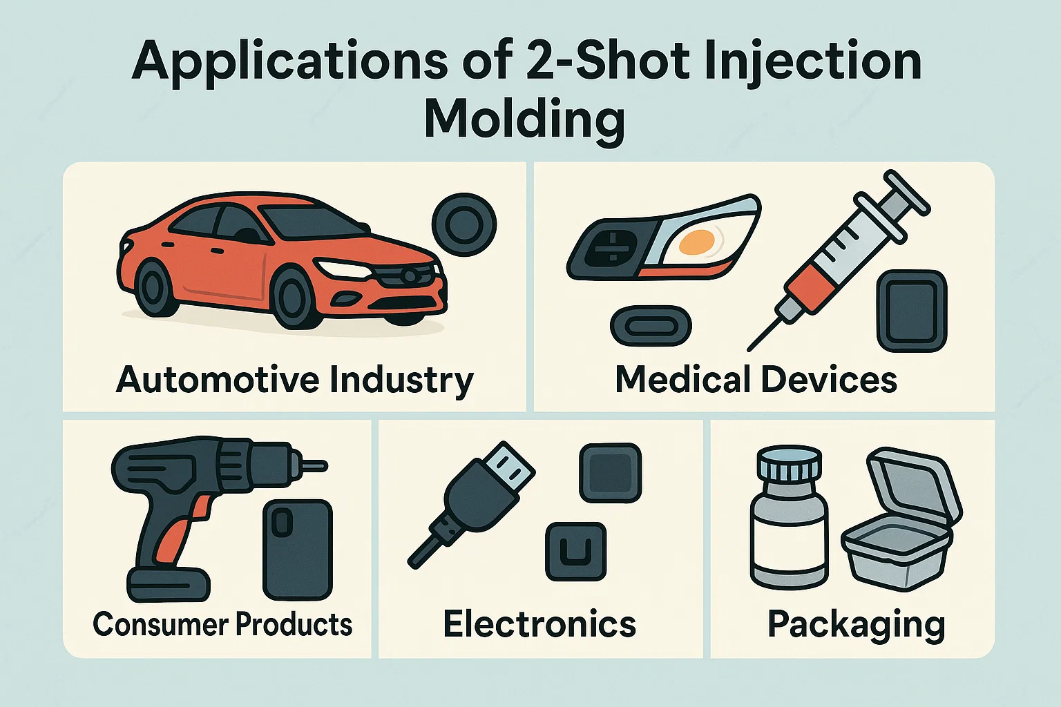 De unieke combinatie van functionaliteit, esthetiek en efficiëntie aangeboden door 2-shot spuitgieten maakt het een voorkeursmethode in een breed spectrum van industrieën. Het vermogen om een enkel, multi-materiaal onderdeel in één cyclus te creëren, heeft complexe ontwerp- en assemblageproblemen opgelost, wat leidt tot verbeterde productkwaliteit en prestaties in de volgende sectoren.
