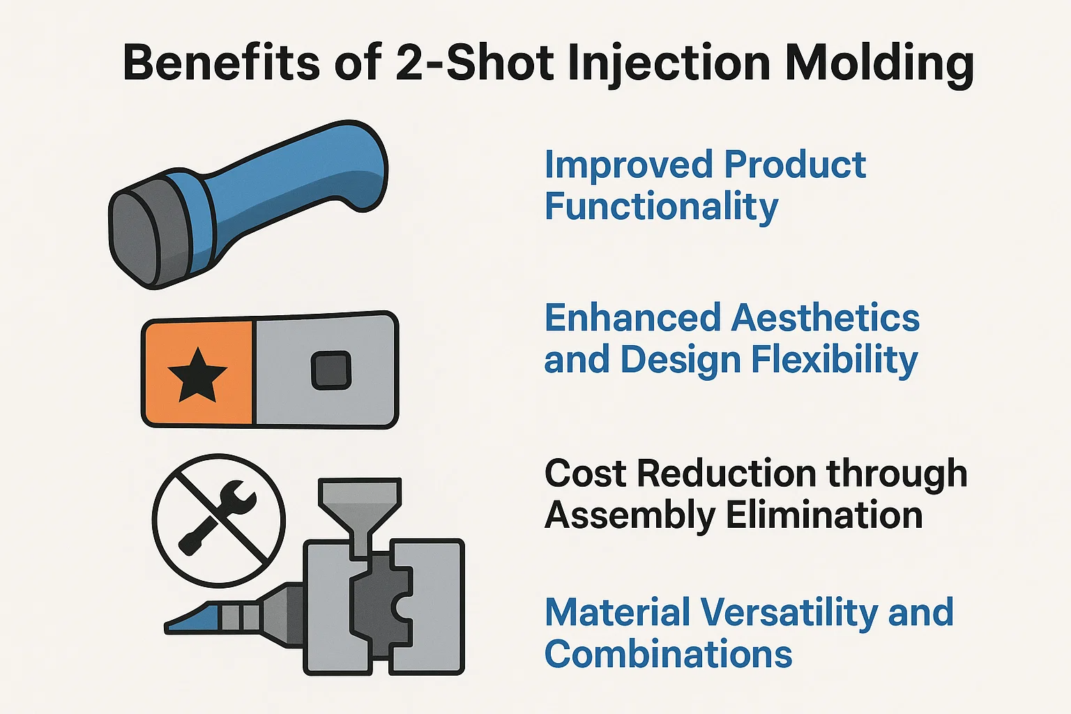 Betere grip en ergonomie: Voor consumenten-, medische en industriële producten is de mogelijkheid om een zacht, tactiel elastomeer op een hard plastic oppervlak een belangrijk voordeel te overblokken. Dit verbetert de grip van de gebruiker, verbetert het comfort en kan een veiligheidsniveau bieden dat niet haalbaar is met één materiaal.