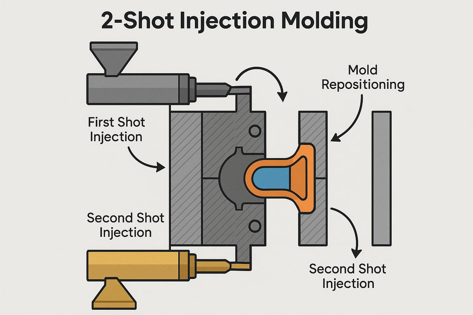 Het fundamentele principe van 2-shot spuitgieten is de sequentiële injectie van twee materialen in een speciaal ontworpen schimmel. Het proces volgt in het algemeen deze belangrijke stappen: