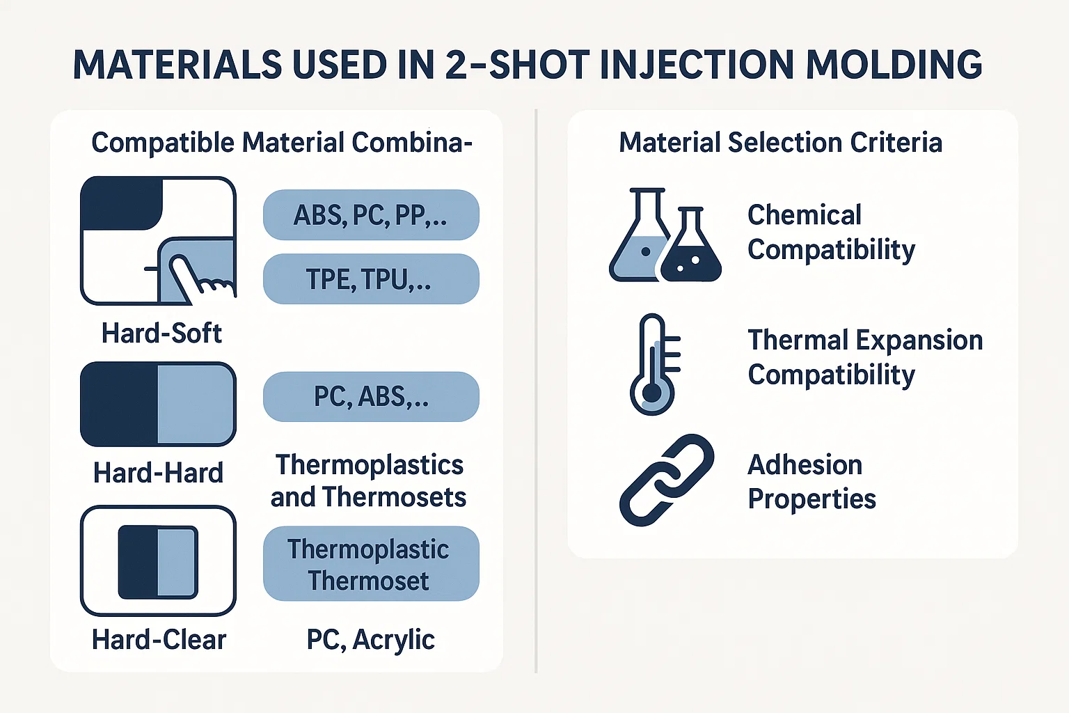 Het succes van elk 2-shot spuitgietproject hangt af van de zorgvuldige selectie van materialen. De twee polymeren moeten niet alleen voldoen aan de functionele en esthetische vereisten van het eindproduct, maar ook compatibel met elkaar zijn om een sterke, duurzame binding te vormen. Deze sectie onderzoekt de soorten materiaalcombinaties en de kritische criteria voor het selecteren ervan.