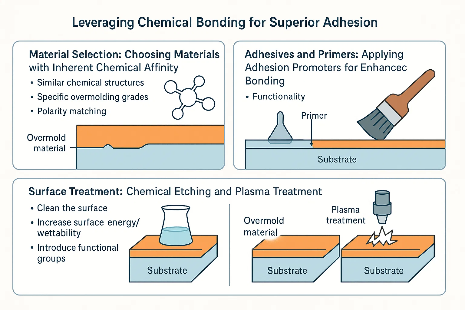 Terwijl mechanische vergrendeling een sterk fysiek anker biedt, chemische binding Biedt het hoogste niveau van hechting, waardoor een vrijwel onafscheidelijke interface tussen het substraat en het overmoldmateriaal ontstaat. Deze methode is gebaseerd op de werkelijke moleculaire interactie tussen de twee polymeren, wat leidt tot een binding die vaak sterker is dan de samenhangende sterkte van beide materialen.