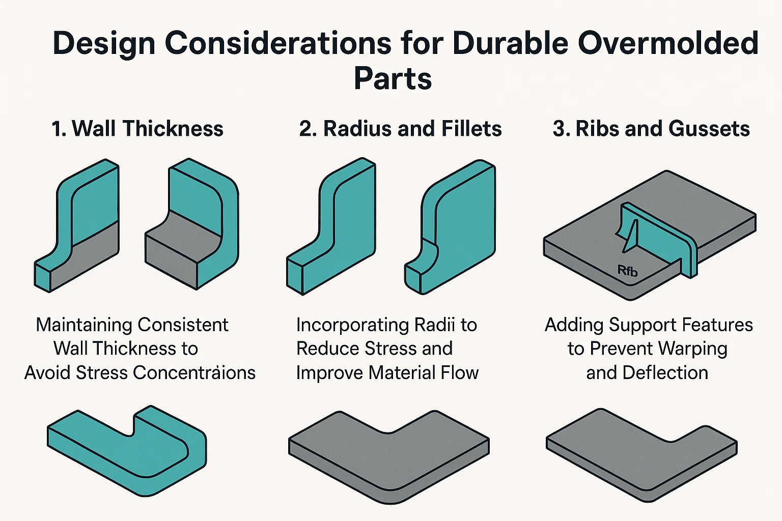 Wanddikte: Handhaven consistente wanddikte In het overmold materiaal zorgt voor uniforme koeling en krimp, waardoor interne stress wordt geminimaliseerd. Abrupte veranderingen in wanddikte kunnen leiden tot differentiële koeling, kromtrekken en verzwakte bindingen.