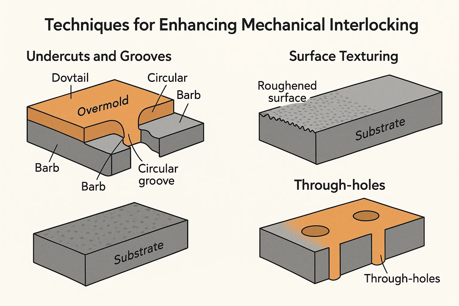 Zie ondersneden en groeven als microscopische haken of ankers in het substraat. Wanneer het gesmolten overmold materiaal in deze functies stroomt en afkoelt, stolt het eromheen, waardoor een fysiek slot ontstaat.