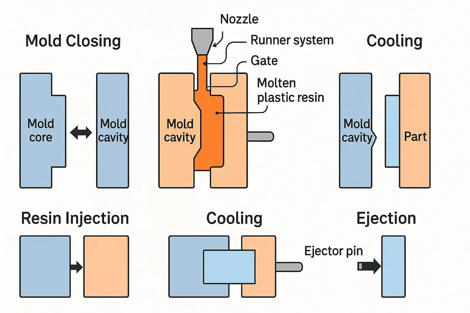 Sluiting van schimmels: Het proces begint met de schimmelkern en de schimmelholte die naar elkaar toe bewegen totdat ze aan elkaar klemt. Deze actie creëert de verzegelde interne leegte - de vorm van het laatste deel. De nauwkeurigheid van deze afstemming is van cruciaal belang, omdat elke verkeerde uitlijning een "flash" (Overtollig materiaal dat langs de scheidingslijn sijpelt).
