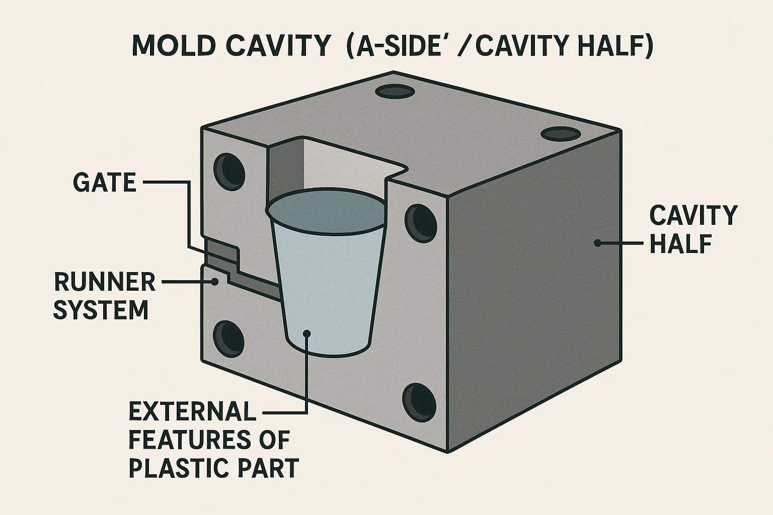 De schimmelholte , ook bekend als de "a-side" of "holte helft", is de component die de vormt externe functies van het plastic deel. Het is de buitenste schaal of container die de gesmolten plastic vult. Met behulp van de plastic bekeranalogie zou de holte de buitenkant van de beker vormen, inclusief de lip- en buitenmuren.