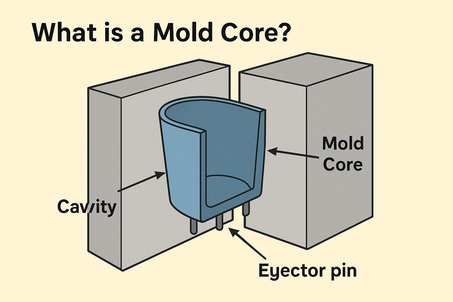 Als u bijvoorbeeld een plastic beker vormt, zou de kern het deel zijn dat de binnenkant van de beker vormt. Voor een holle doos zou de kern de binnenruimte vormen. De kern bevat meestal ook functies zoals ejectorpennen, die worden gebruikt om het afgewerkte deel uit de mal te duwen nadat het is afgekoeld. Omdat het de interne vorm vormt, heeft de kern vaak een complexer ontwerp met functies zoals ribben, bazen (cilindrische uitsteeksels voor montage) en Enere ingewikkelde details.