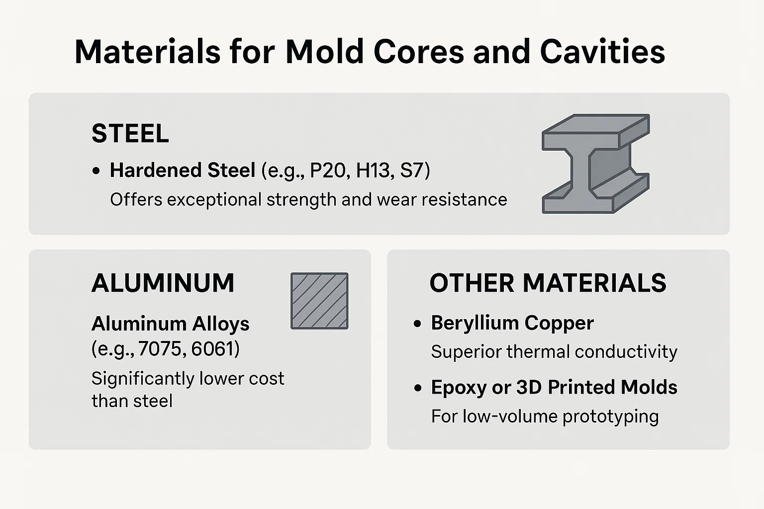 Het materiaal dat wordt gekozen voor de schimmelkern en de holte is van cruciaal belang, omdat het direct de duurzaamheid, kosten en het vermogen van de schimmel beïnvloedt om onderdelen van hoge kwaliteit efficiënt te produceren. De selectie hangt af van factoren zoals het type plastic dat wordt gevormd, het vereiste productievolume en de complexiteit van het onderdeelontwerp.