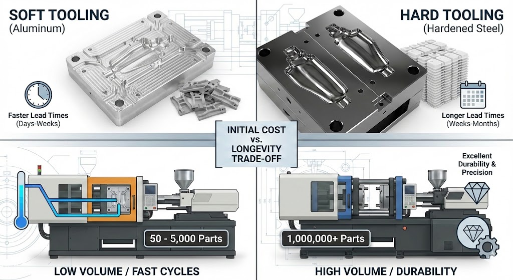 Bent u beperkt door initiële kapitaaluitgaven (Capex)? Soft tooling verlaagt de stickerprijs vooraf. Als u echter over het kapitaal beschikt, biedt hardtooling op de lange termijn een lagere stukprijs, waardoor de operationele uitgaven (Opex) afnemen.