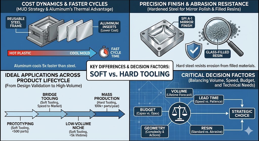 - Zacht gereedschap Advantage: Aluminium heeft een aanzienlijk hogere thermische geleidbaarheid dan staal. Het trekt de warmte veel sneller uit het plastic, waardoor het onderdeel sneller kan stollen. Voor een productierun van 5.000 onderdelen kan de snellere cyclustijd van een aluminium gereedschap soms de hogere initiële kosten compenseren in vergelijking met een zeer goedkoop stalen gereedschap.