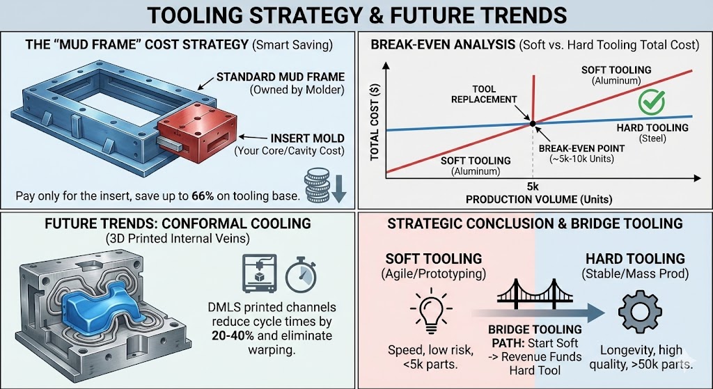 - Hard gereedschap Reality: Staal houdt de warmte langer vast. Om snelle cyclustijden met hard gereedschap te bereiken, zijn vaak complexe, geboorde interne koelkanalen (“conforme koeling”) vereist, waardoor de gereedschapskosten verder stijgen.