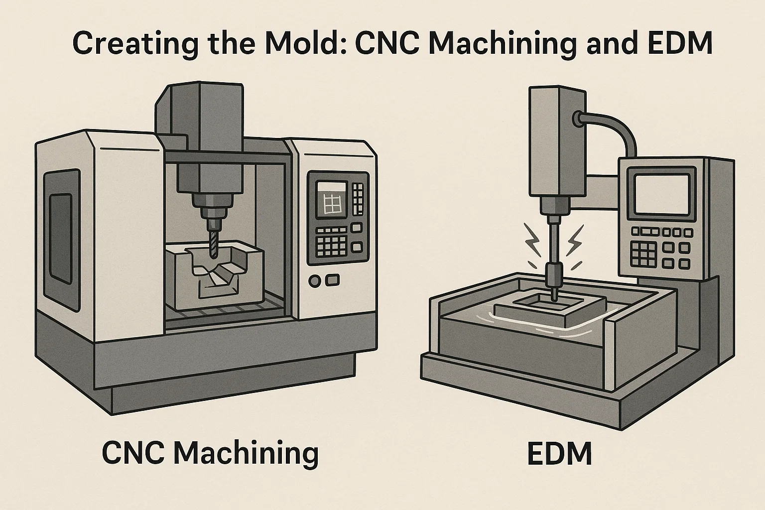 Het creëren van een schimmel volgt meestal op een synergetische benadering, die zowel CNC als EDM combineert: