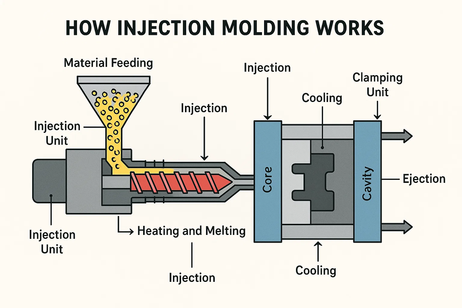 Stel je een sterk gecontroleerd en geautomatiseerd proces voor dat in enkele seconden ruwe plastic pellets transformeert in een perfect gevormde component. Dat is in wezen wat er gebeurt tijdens spuitgieten. Het proces kan worden onderverdeeld in verschillende belangrijke fasen: