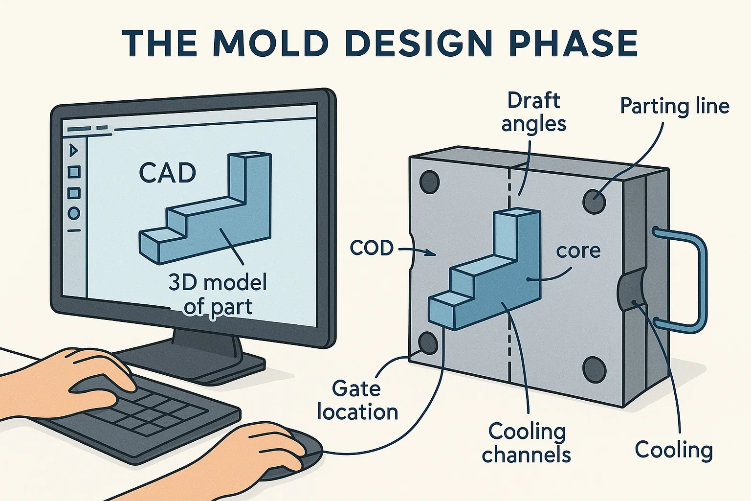 Met een duidelijk begrip van hoe spuitgieten ruw plastic transformeert in afgewerkte delen, kunnen we nu het belangrijkste belang van de schimmelontwerpfase . Dit is waar de magie echt begint, als abstracte ideeën en 2D -schetsen evolueren naar een precieze digitale blauwdruk die de fysieke creatie van de mal zal begeleiden. Het is een zorgvuldig proces waarbij elke curve, hoek en dimensie van het uiteindelijke onderdeel van het plastic model zorgvuldig wordt overwogen en vertaald in de geometrie van de vorm.