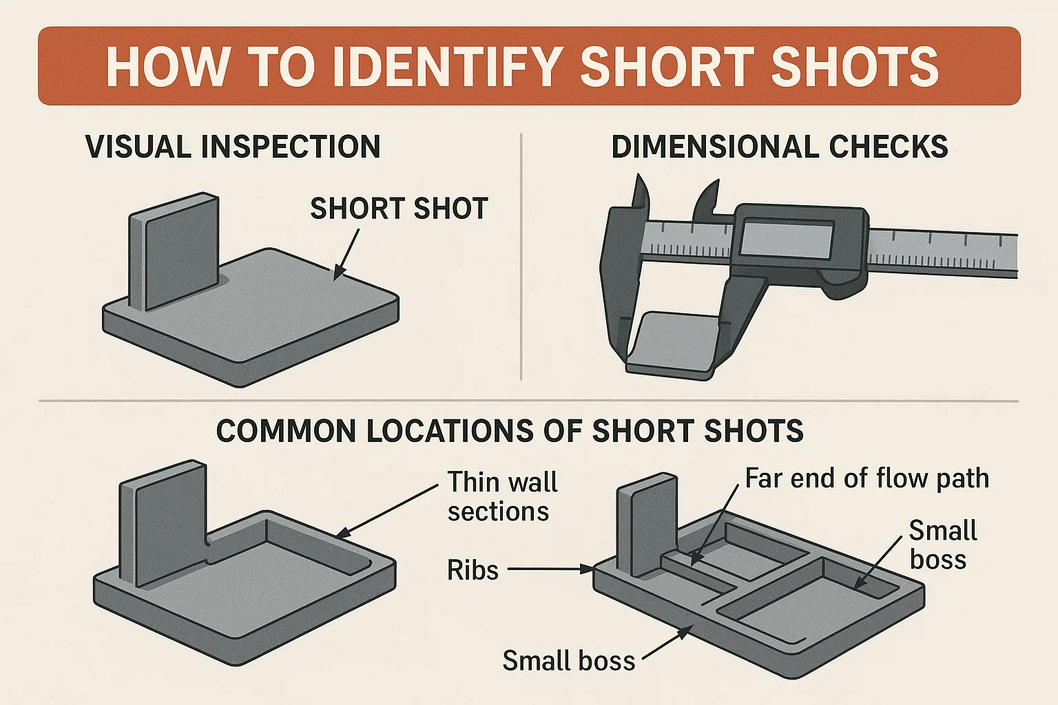 Hoewel een visuele controle vaak voldoende is, kan het uitvoeren van een dimensionale controle meer specifieke informatie bieden, vooral voor onderdelen met complexe geometrieën. Als je een deel hebt dat eruit ziet bijna Compleet maar u bent niet zeker, meet de lengte, breedte en hoogte. Een kort schot zal niet voldoen aan de vereiste afmetingen, omdat het onderdeel de hele schimmelholte niet heeft gevuld. Voor onderdelen met dunne wanden is een korte opname misschien niet zichtbaar duidelijk, maar een dimensionale controle zal het probleem bevestigen.