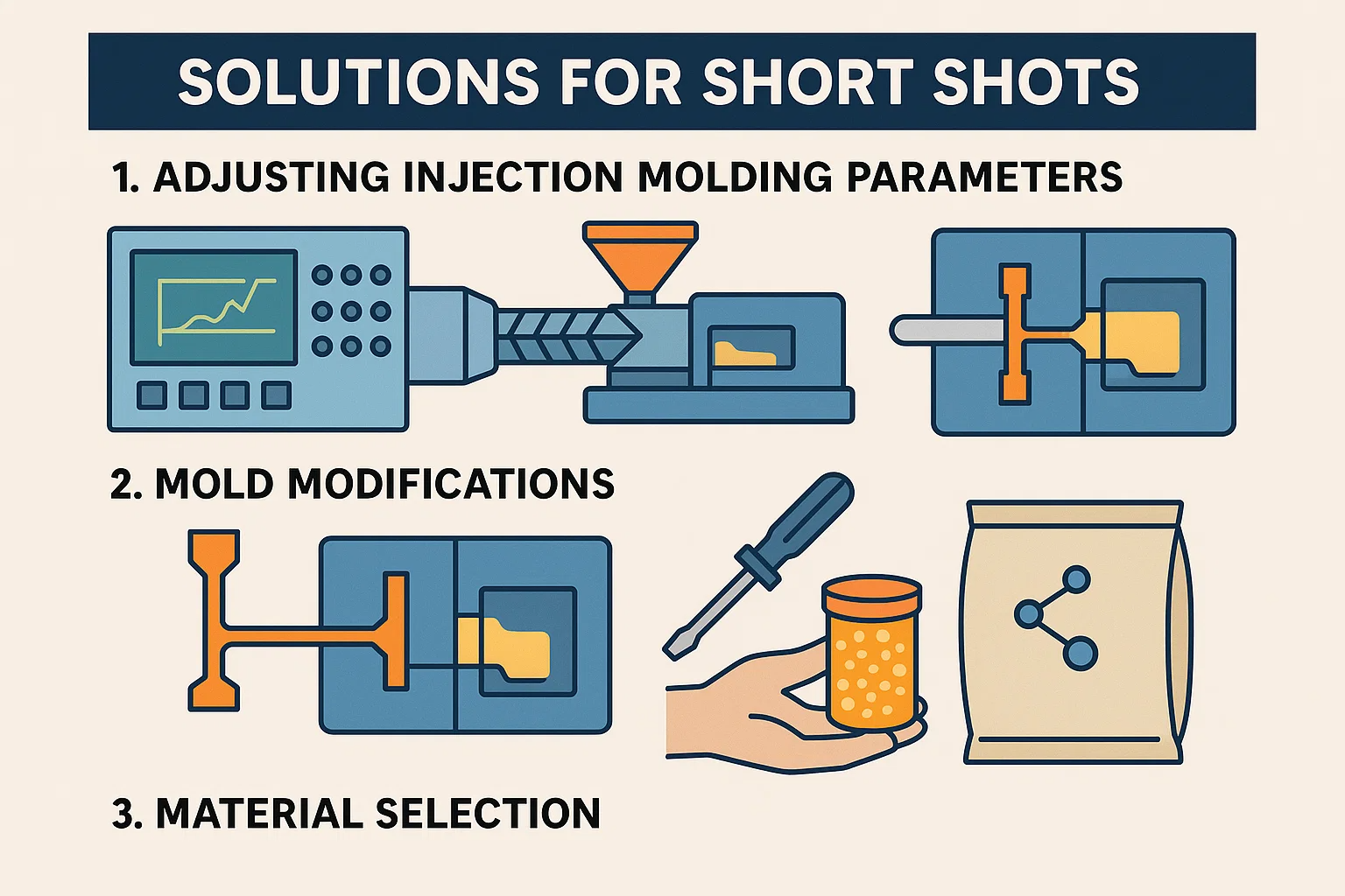 Het oplossen van een korte opname vereist een strategische aanpak. Het is vaak het beste om te beginnen met de gemakkelijkste en meest kosteneffectieve oplossingen voordat u naar meer complexe en dure verhuist. Begin met machine -instellingen, overweeg vervolgens materiaal en kijk ten slotte naar de mal zelf.