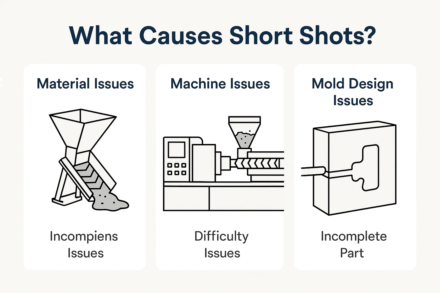 Het diagnosticeren van een korte opname vereist een systematische benadering, omdat de oorzaak kan voortkomen uit verschillende gebieden van het spuitgietproces. De meest voorkomende problemen kunnen worden herleid tot het materiaal, de machine -instellingen of het schimmelontwerp zelf.