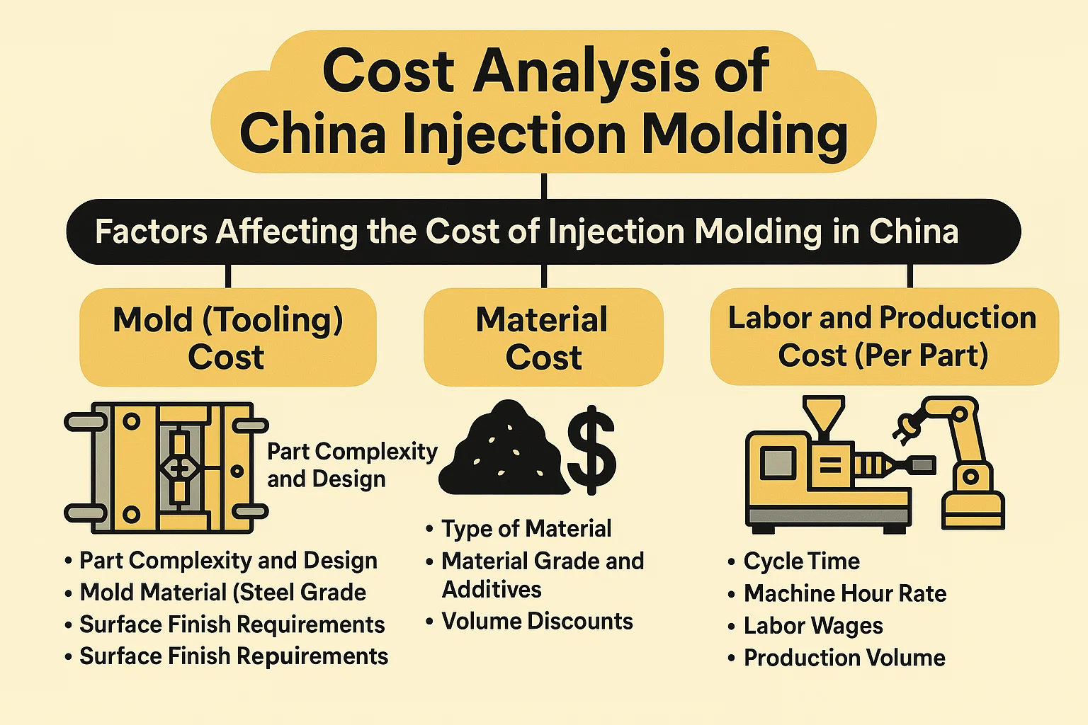 Een van de belangrijkste motivaties voor bedrijven om China te kiezen voor spuitgieten is het waargenomen kostenvoordeel. Hoewel China over het algemeen meer concurrerende prijzen biedt dan veel westerse landen, is het inzicht in de verschillende factoren die bijdragen aan de totale kosten cruciaal voor nauwkeurige budgettering en het vermijden van onverwachte kosten. De totale kosten van een spuitgietproject kunnen in grote lijnen worden onderverdeeld in mal (gereedschap) kosten, materiaalkosten en productiekosten (arbeid/machine).