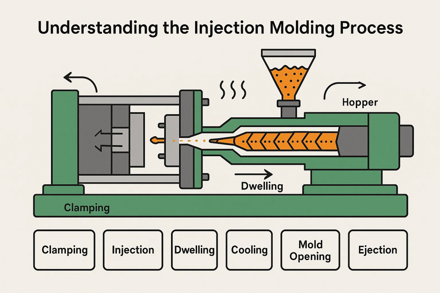 Het spuitgietproces is een cyclische werking die, hoewel het eenvoudig lijkt, een precieze controle van temperatuur, druk en timing omvat om consistente onderdelen te creëren. Hier zijn de fundamentele stappen: